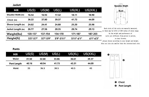 Sizs XL:Shoulder—-18.11” Chest:41.73” Sleeve—-25.2” Jacket Length—-28.74” Waist—-36.61”-40.5” Pants Length—-40.5”