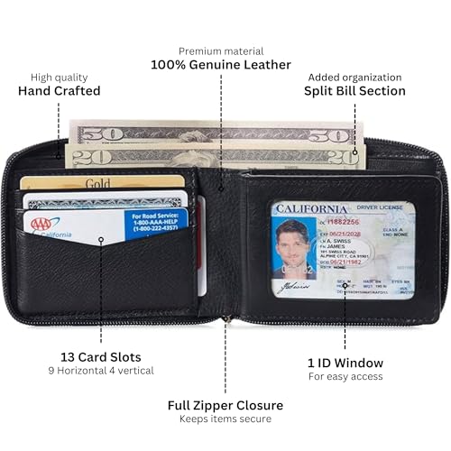 Alpine Swiss Logan Zipper Bifold Wallet For Men or Women RFID Safe Comes in a Gift Box Black