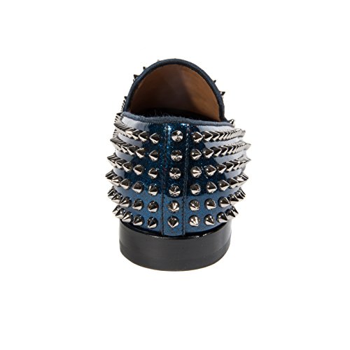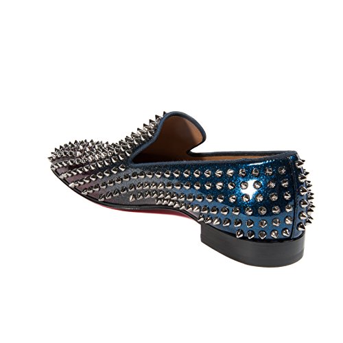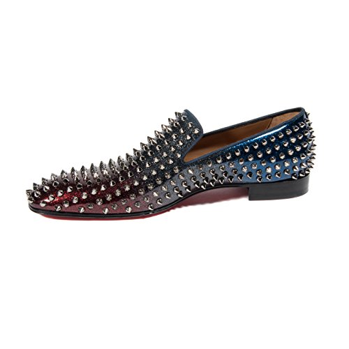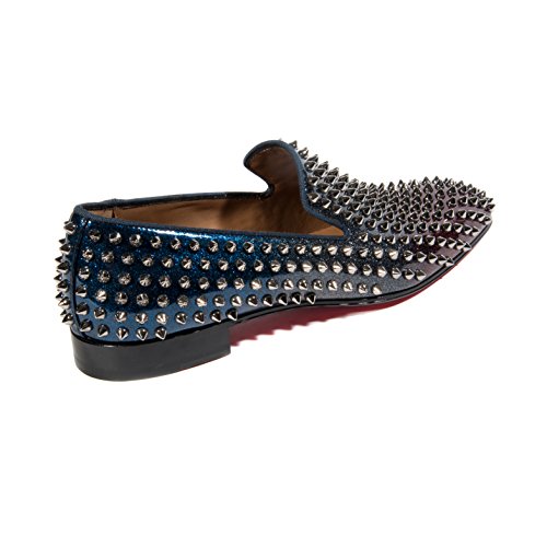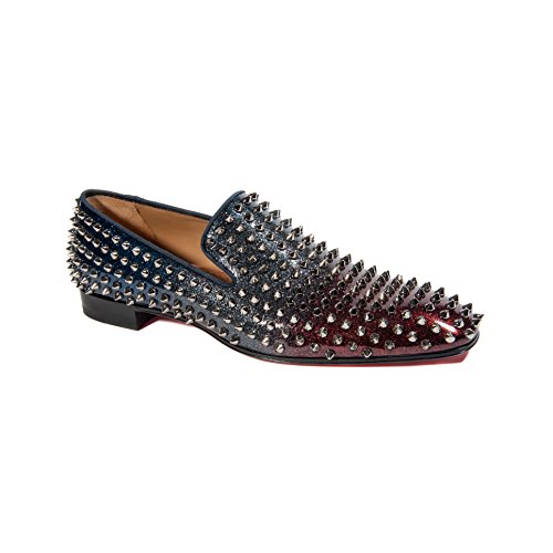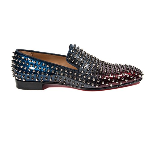 Product details: Sparkling loafers in red and blue color, with silver metal spikes, low heels. Elongated and rounded toes. Christian Louboutin’s signature red sole with brand logo. Color: blue, red Materials: sole: leather lining: leather upper: leather Heel (cm): 2