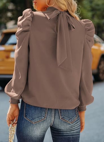 Dokotoo Womens Ladies Puff Long Sleeve High Neck Fall Winter Tops Turtleneck Tie Knot Back Solid Pullover Blouses for Women Casual Loose Shirts Browm XX-Large Brown