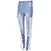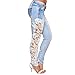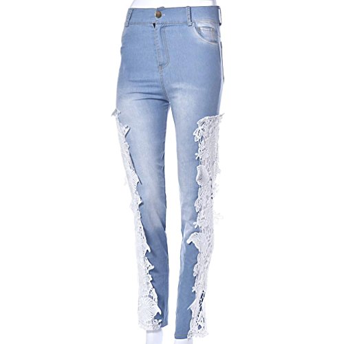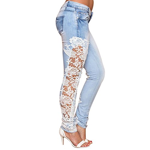Ecurson Long Lace Floral Skinny Spliced Hollow out Hole Straight Denim Jeans (M)