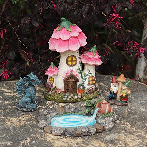 • FAIRY GARDEN DECOR KIT: The elf gnome couple, dragon, fountain, fairy house (set of 4) garden sculptures statues are handcrafted and made of high quality durable resin material. The yard decor accessories can withstand many different types of weather conditions, such as hot sun, rain, snow, frost, good for outdoor, garden, lawn, porch, patio, balcony, indoor home decorations