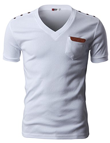 H2H Mens Basic Cotton V-neck T-shirts with Point Shoulder Button Leather Pocket WHITE US L/Asia XL (JDSK16)