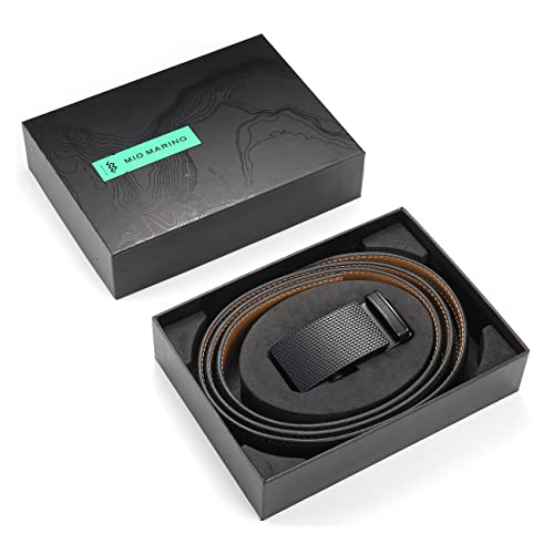 Marino Men’s Genuine Leather Ratchet Dress Belt with Automatic Buckle, Enclosed in an Elegant Gift Box – Black Buckle with Black Imprinted Leather – Custom: Up to 44″ Waist
