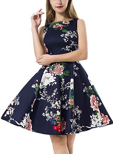 NINEWE Women’s Classy Audrey Hepburn 1950s Vintage Rockabilly Swing Dress (S, Navy Flower)