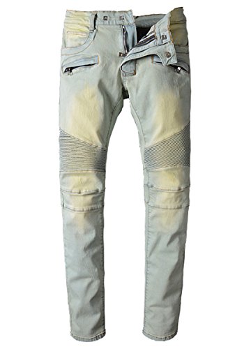 • TRENDY DESIGN - Modernize your casual wardrobe with the fashion-forward style of these Moto jeans from OKilr Pjik. The slim fit and bleached wash put an edgy finish on your street-ready look. Destruction detailing at legs. Ribbed thigh panels. Articulated knee panels. Zip fly with button closure. Five pocket styling. Mid rise and belt loops design
