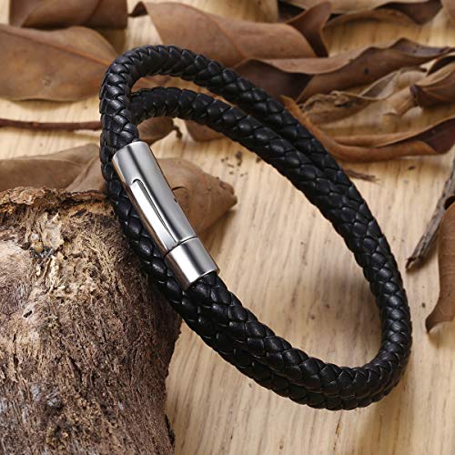 Trendsmax 6mm Double Black Braided Cord Rope Man-Made Leather Bracelet Only 8inch Stainless Steel Clasp