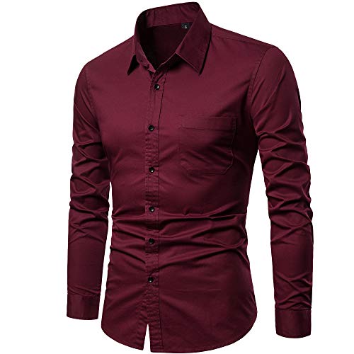 VANCOOG Men’s Long Sleeve Cotton Casual Interview Formal Subdeued Dress Shirt-Wine Red with Pocket-L