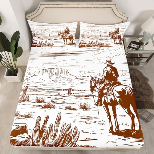 Western Bed Sheets Set Queen, Farmhouse Cowboy Bedding Set Western Bedding, Country Southwest Desert Sheet Set, American Wild Cactus Sheets, Vintage Hand Drawn Print 4Pcs Top Sheet for Boys Men
