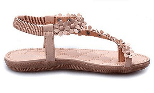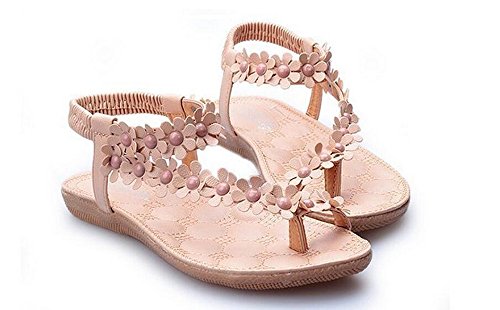 Women Bohemia Style Sling Sandals Flower Beads T-Strap Flip Flop Flats Slip On Thong Sweet Shoes (Beige, 9 B(M) US/40EU)