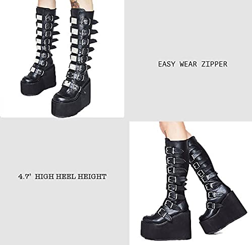 Womens Goth Knee High Boots Wedge High Heel Motorcycle Platform Combat Ankle Boots